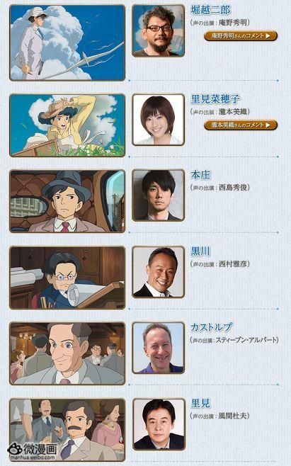 宫崎骏一直喜欢找名演员来给自己动画电影中的角色配音,此前新作动画电影《风雪黄昏》已经公开了主角堀越二郎将由著名的动画导演庵野秀明献声,而现在详细的声优情报发表。