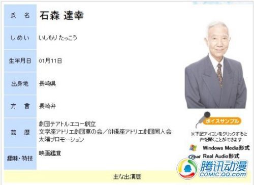 石森达幸作为老一辈声优,动漫迷们可能并不怎么熟悉,毕竟声优除了动画以外还有许多其他工作。他是回声剧场的创办成员之一,并且被很多现役的人气声优所敬仰。早在四五十年前的《巨人之星》时代,石森达幸就配了许多动画配角。而最近为大家所熟知的,可能就要数《海贼王》里的佛之战国了,其他的还有《钢之炼金术师FA》里的克塞鲁克国王和《精灵守护者》的圣导师等等。让我们衷心祝愿他老人家一路走好。