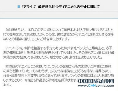在2008年6月有动画化企划的安达渡嘉漫画「最终进化的少年」,因为原定的动画制作公司GONZO,而由于GONZO各种重组,导致动画化也因此企划废止,不知还用没有重启的时候?不过大家可以先期待新作「野良神」的动画!