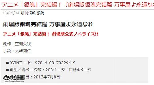 剧场版动画《银魂 完结篇 永远的万事屋》即将于7月6日上映,现在本作的小说版也发售决定,作者为曾执笔《3年Z组银八先生》(《银魂》小说版)《BLACK CAT》《滑头鬼之孙》小说版的大崎知仁,售价683日元,预定2013年7月8日发售。