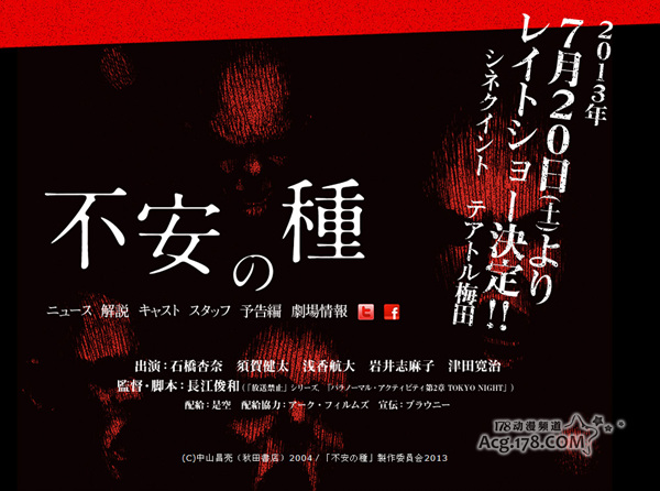 由日本漫画家中山昌亮的单元剧恐怖漫画改编的真人电影「不安的种子」,将于2013年7月20日上映。目前在漫画中出现的オチョナンさん的造型得到公开,电影将以某街道的某起交通事故作为开端,描绘在街道中潜伏的各种怪异现象。