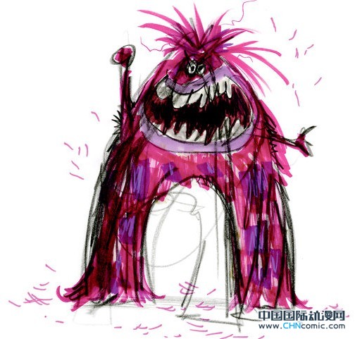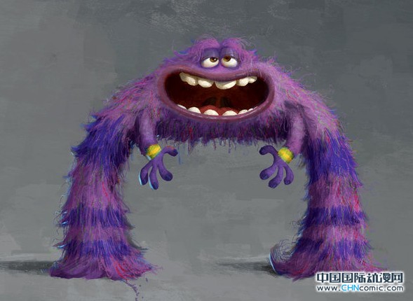 这幅涂彩画稿,是由艺术指导Dice Tsutsumi所作。设计师称之为“探索色彩与毛皮。”角色形象建立起来的最后一个流程,在这之后便交给建模组开始设计模型与粘土雕塑。Art,全身上下紫色的想法来自Tsutsumi,而明暗相间的条纹则来自Sasaki的主意。“我记得自己想要把他做成条带状,那种感觉就像筒袜一样。”Sasaki说。同样,在整个设计开发的道路上一直保持不变的特点就是Art的大嘴巴,它会占用其脸部很多空间,制作人员不希望它的牙齿很锋利。