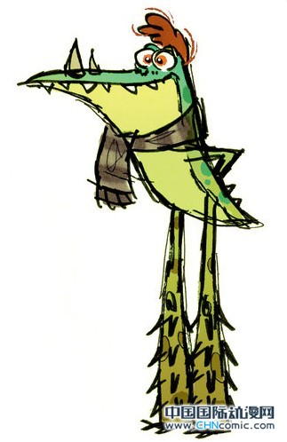 最初,导演斯堪隆决定让Art成为影片中颇具份量的新角色。因此,Sasaki就开始绘制草图,如上图所示,它看起来就像一个戴着围巾的鳄鱼。Sasaki说:“对于Art的早期角色设定,我们一直执着于长条般的身形、高挺的胸部,给人一种戏剧化、夸夸其谈的印象。”但是后来故事走向了不同的发展方向,Art就变得更加神秘了。