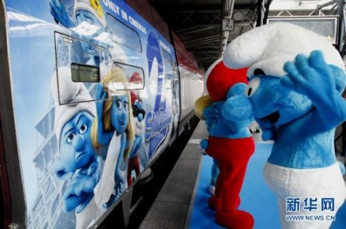 在比利时首都布鲁塞尔火车南站,“蓝精灵淘淘”在前往巴黎的专列客车上看见自己的形象。
