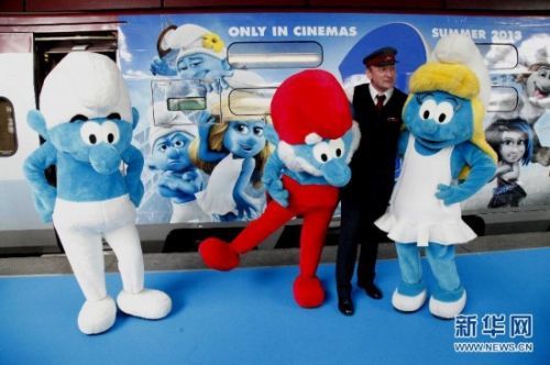 在比利时首都布鲁塞尔火车南站,一列前往巴黎的“蓝精灵”专列前,工作人员与“蓝妹妹”、“蓝爸爸”和“淘淘”合影。