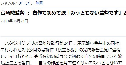据悉,宫崎骏于6月24日出席了最新指导作《起风了》的完成报告见面会,透露说在前日召开的《起风了》完成试映会上,生平第一次因为自己拍摄的影片而落泪,“看了自己的影片而哭什么的太不像话,我是个不像话的监督”。《起风了》预定7月20在日本全国上映。