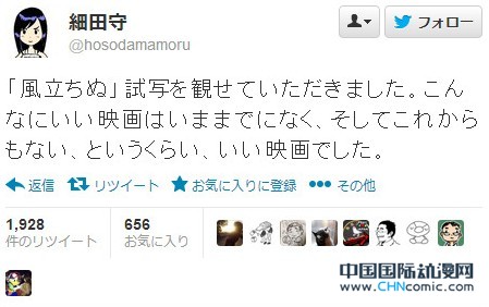 宫崎骏新作《起风了》的试映会结束以后,观看完这部作品的著名动画监督细田守在推特上发表看法,对《起风了》这部动画电影赞不绝口。细田守监督说:“我刚刚参加了《起风了》的试映会。这部动画太棒了,以前从来没有过,甚至让人感觉今后恐怕也难以超越”。