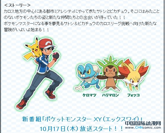 NDS游戏《Pokémon X and Y》译(《口袋妖怪X/Y》)即将在10月12日于全球同步发售,而动画官网也宣布了故事将在10月17日进入《口袋妖怪X/Y》篇章,小智和比卡丘将继续在Kalos地区继续他们的冒险。
