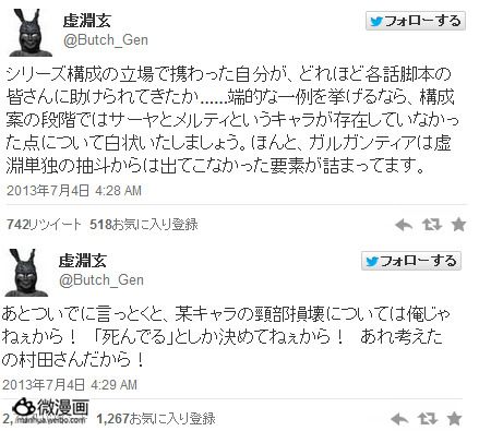 此外虚渊玄还表示“某中佐在动画中颈部损坏这不关我的事,我只是说了他会死,剩下的都是村田监督想出来的!”。此前因为虚渊玄担任脚本的《魔法少女小圆》的掉头场面太过著名,所以《翠星加尔刚蒂亚》中再次出现“掉头”时,很多FANS都以为又是虚渊玄的桥段。
