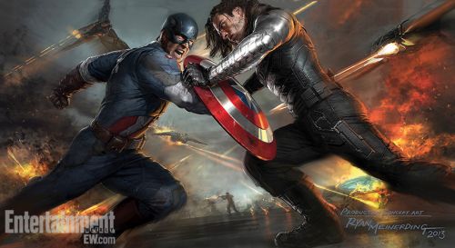 《娱乐周刊》网站今天曝光一张新的《美国队长2:寒冬战士》(Captain America: The Winter Soldier)概念艺术,图片上曾经是至亲好友的“美国队长”史蒂夫·罗杰斯(Steve Rogers)与“巴奇”詹姆斯·巴恩斯(James “Bucky” Barnes)纠打在一起。