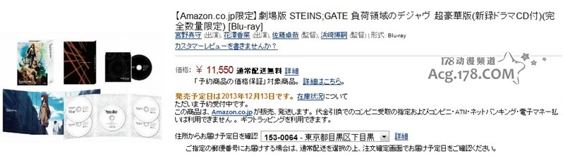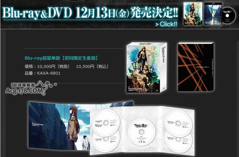 于今年4月20日上映的剧场版动画《命运石之门》,近日确定了DVD\BD的具体发售时间为2013年12月13日发售,初回限定版BD售价10500日元,若你在AmazonJP预定则将可以以11550日元的价格购买到收录了新录的广播剧CD的完全数量生产限定版。收录的广播剧CD内容将是来自剧场版《命运石之门 负荷领域的既视感》的过去的故事「红莉栖的日本之旅」,描绘助手在归国前数日的故事,以及角色们在秋叶原的日常。