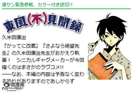 作为小学馆《少年SUNDAY》夏之感谢祭的特别企划之一,《妄想改造人改藏》《再见了绝望先生》漫画作者久米田康治确认将在下周发售的《少年SUNDAY》上刊登新短篇《东风(不)见闻录》。