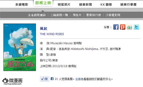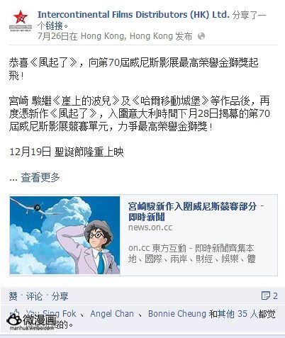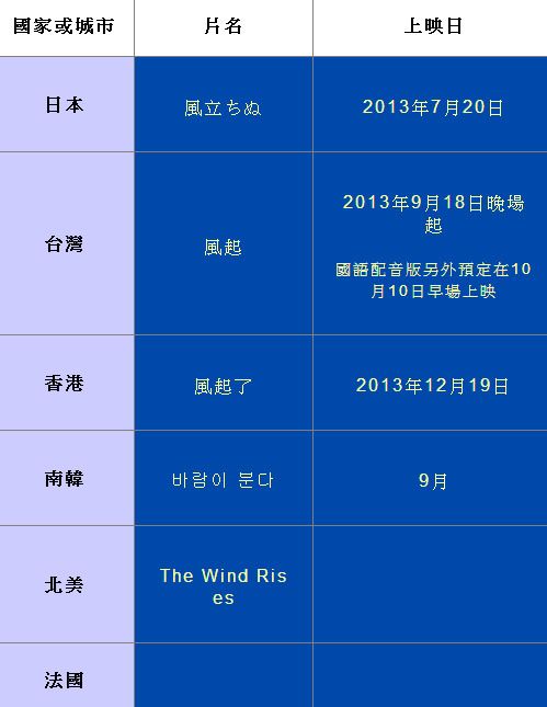 在香港地区,《風立ちぬ》则将以《风起了》的标题在12月19日圣诞前夕上映。消息来源是洲立影片的FACEBOOK主页。