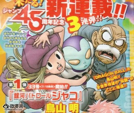 《银河巡警JACO》是继2000年在《少年JUMP》连载全14话的《SAND LAND》以来,鸟山明时隔13年再次在《少年JUMP》刊登连载。讲述决心拯救地球,而从数万光年的远方而来的银河第一自傲的正义使者JACO的物语。已从7月发售的《少年JUMP》创刊45周年纪念号上开始连载。