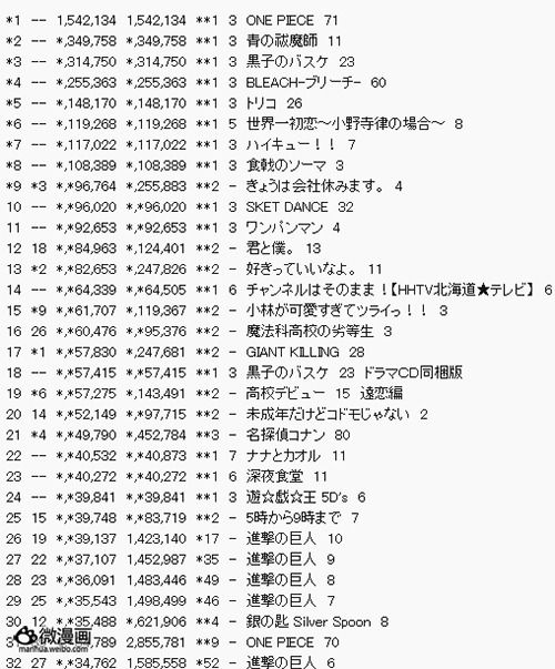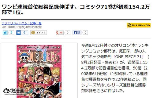据最新发表的Oricon周间畅销书榜,8月2日发售的尾田荣一郎人气漫画《海贼王》单行本第71卷以首周154.2万本的销量,毫无悬念的获得了周榜第1名。