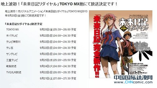 另外,7月发售的OAD《未来日记Redial》宣布将进行TV放送,预定9月20日25:30~26:00在TOKYO MX台首播,之后千叶电视台、神奈川电视台、埼玉电视台、SUNTV、三重电视台、岐阜电视台、TVQ九州放送、BS11也会陆续播出。