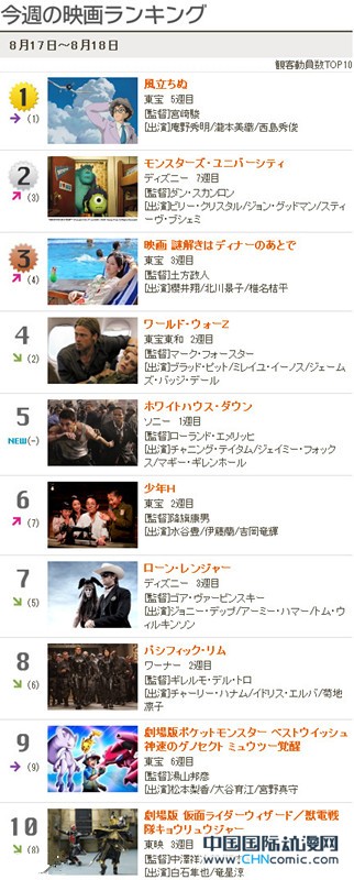 据日本興行通信社票房数据,在最新一周日本电影票房榜上,宫崎骏监督的动画电影《起风了》以周末2天动员观众人数35万2322人,票房4亿7379万日元的好成绩,连续第5周位列榜首。