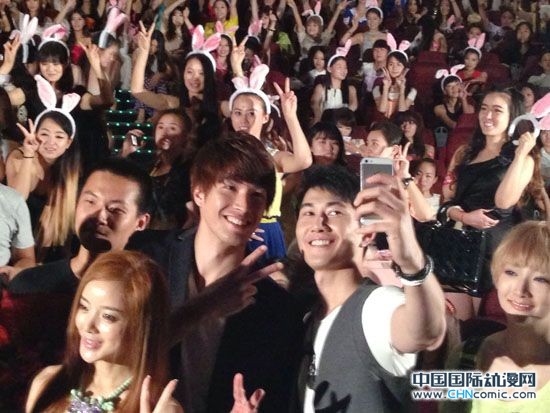 首映当天另一位帅哥则是天后蔡依林的准男友锦荣,中文不怎么好的他面对媒体的各种提问,一时招架不住,还好有阿雅好心解围,才得以幸免。因主办方安排,发布会现场惊现众多兔女郎,擅长搞热气氛的阿雅更是提议全场大合影,因戏结缘的何明翰与锦荣也借机卖萌玩起了自拍。