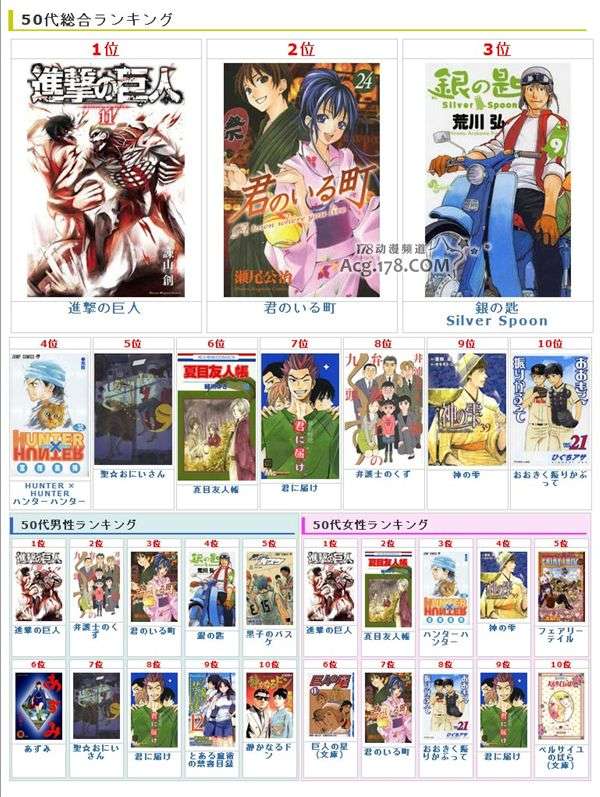 而50几岁的男性・女性榜上也有着「百人斩少女」、「巨人之星」、「凡尔赛玫瑰」、「内衣教父」等历久弥新的经典之作,这些作品可以说之具有着时代标志意义的。下面就是各个年龄层的具体人气销量排行。
