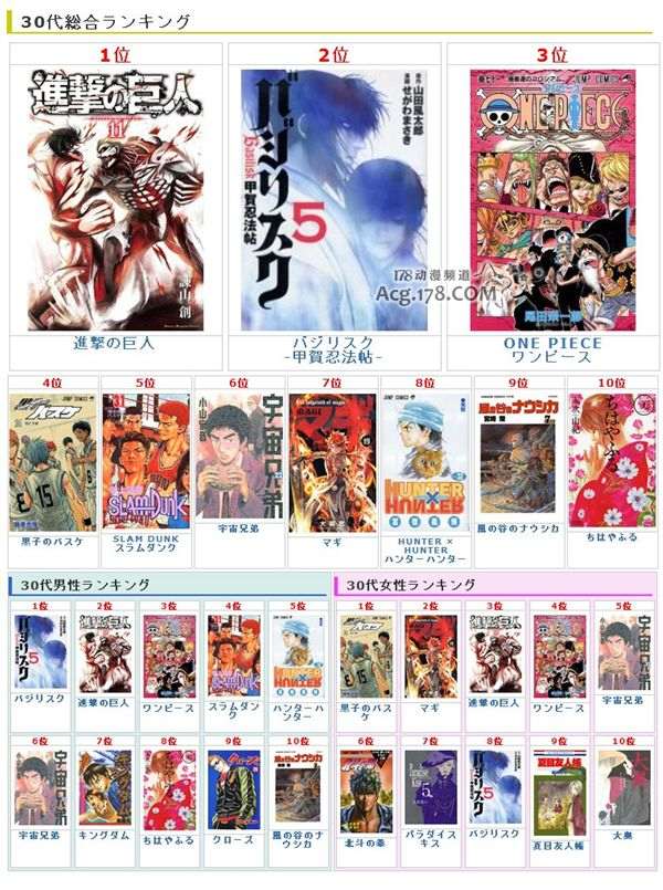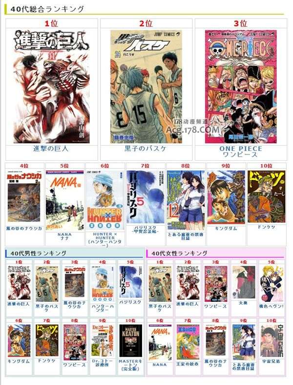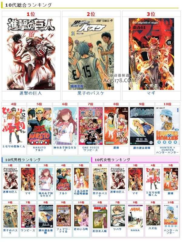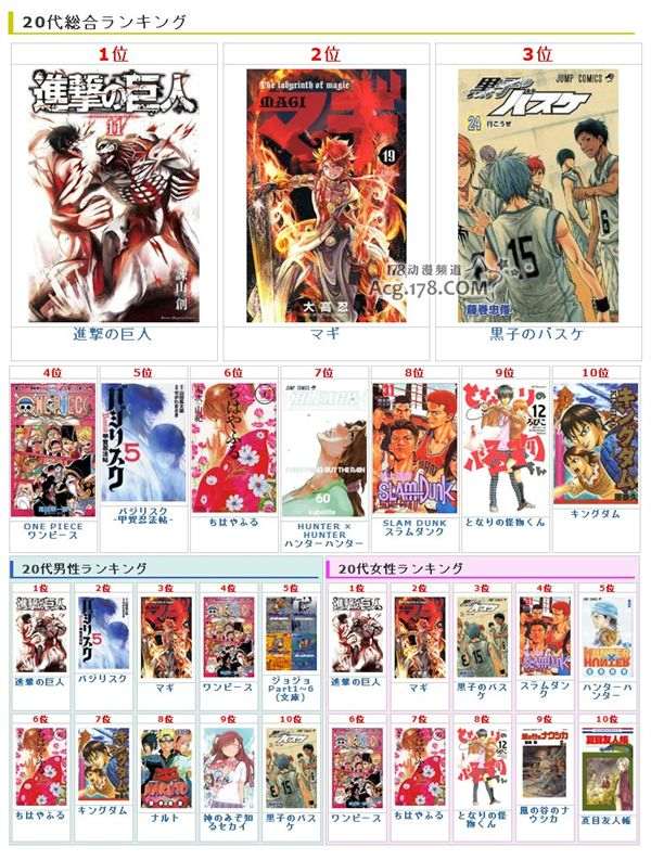 近日「全卷读破.COM」这个网站对2012-2013年间全卷漫画的销量以及客户进行统计,得出了各年龄层中最受欢迎日本漫画排名。同时男女各代喜好的作品也得到公开,我们来看看他们的统计结果。