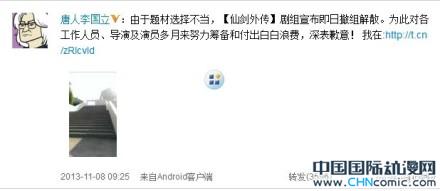 事情发生突然,还等不及粉丝们消化微博信息,李国立又火速将该微博秒删,《仙剑外传》电视剧是真的不拍了,还是炒作不得而知。