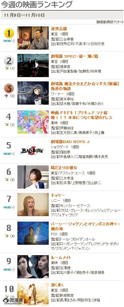 10月26日上映的动画电影《魔法少女小圆 新篇 叛逆的物语》《心跳光之美少女 爱的结婚!?连接未来的希望礼裙》在上周末进入到上映后的第三周,现在据日本興行通信社发布资料,在上周末(11月9日~10日)的日本周末票房·观众人数排行榜上,《魔法少女小圆 新篇》《心跳光之美少女》分别名列第3、4名,保持住了稳重上升的票房势头。