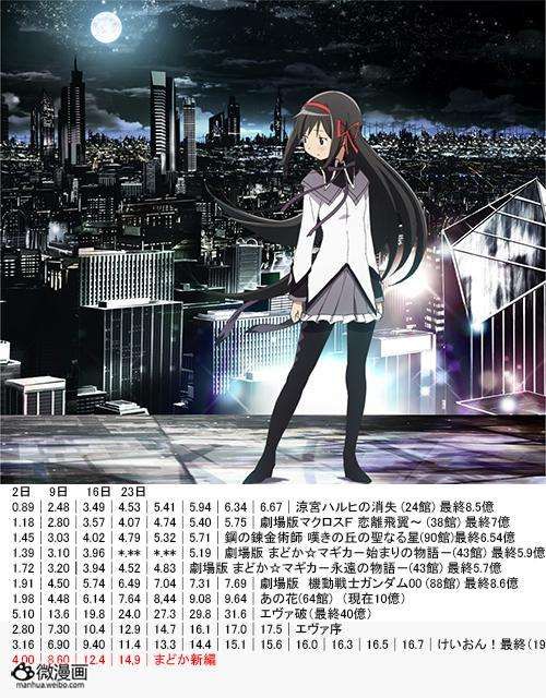 上周五,《魔法少女小圆 新篇 叛逆的物语》刚刚宣布累计观众人数突破百万人,当时的记录是累计观众100万5092人,累计票房收入13亿9145万7150日元。现在2天过后,影片票房再增1亿日元,如果最终票房能达到20亿日元,那么《魔法少女小圆 新篇 叛逆的物语》就将成为深夜动画改编电影中的票房冠军。