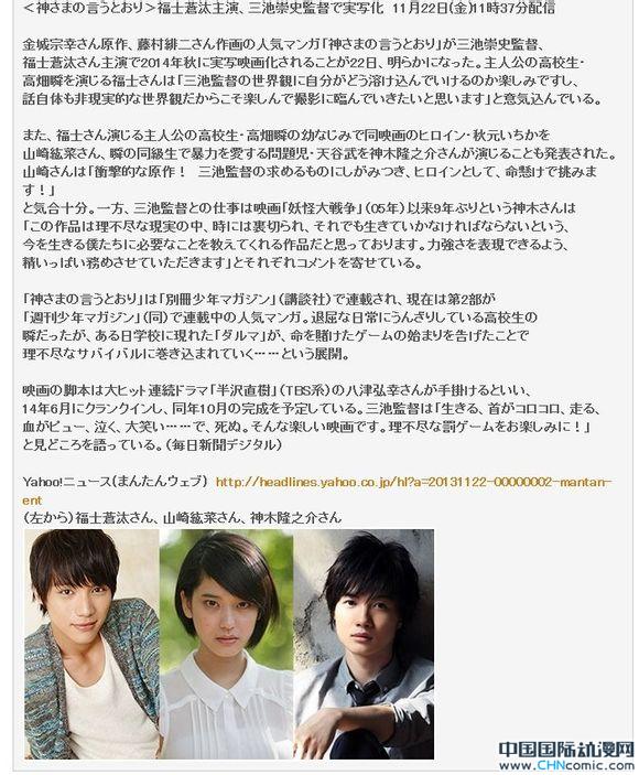 由金城宗幸担任原作、藤村绯二绘制的漫画作品《诚如神之所说》将推出真人版电影!官方并于今(22)日发表了电影《诚如神之所说》将由三池崇史担任监督,并由福士苍汰担纲主演。