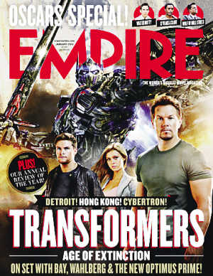 北京时间11月26日消息,据国外媒体报道,由迈克尔·贝执导的2014年科幻巨制《变形金刚4:绝迹重生》(首次曝光汽车人首领“擎天柱”新造型,并与影片三位主演马克·沃尔伯格、妮可拉·佩尔茨、杰克·莱诺一同登上了著名电影杂志《帝国》2014年1月号封面。