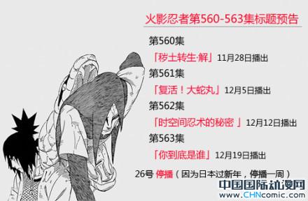 TV动画《火影忍者》12月26号停播!因为日本过新年,《火影忍者》TV动画又要停播一周!大蛇丸要粗来了,离打碎面具也不远了,过完年会不会开始原创就难说了····上周火影忍者漫画也停刊一期,而漫画655话又是不痛不痒的章节,希望AB休息一下后能火力全开啊!!!
