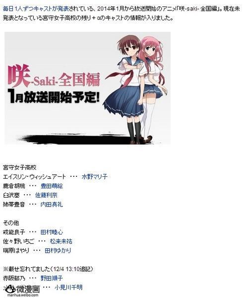 另外,《咲-Saki-全国篇》从11月18日开始每日更新永水女子、姬松高校、宫守女子三校的声优阵容,目前已经公开了早见沙织、水桥香织、赤﨑千夏、寿美菜子等人气声优的出演。从最近2日公开的声优情况来看,之前日本某博客曝光的小道消息声优名单很可能是准确的,根据该小道消息《咲-Saki-全国篇》还将有佐藤利奈 、内田真礼、田村由香里等大牌声优的出演。