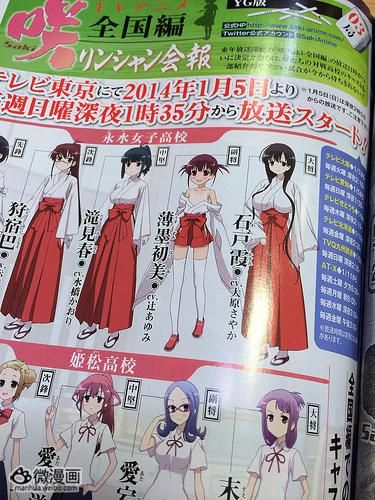 据《Young GANGAN》消息,作为TV系列第三期而推出的TV动画《咲-Saki-全国篇》确认将于2014年1月5日(日)深夜1时35分在东京电视台开播。同时继OP确认由桥本美雪演唱之后,ED也确认由全国篇新角色永水女子、姬松高校、宫守女子三校演唱。