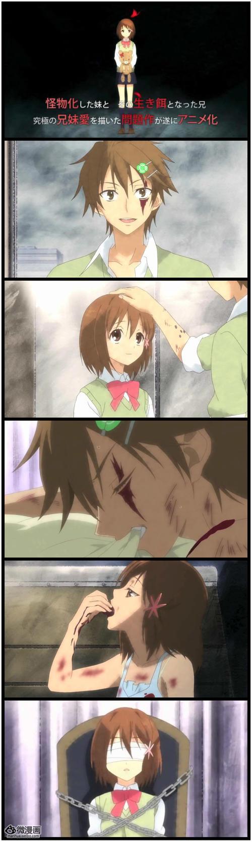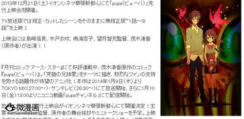 改编自茂木清香的重口漫画,讲述变成吃人怪物的妹妹,与身体可以再生因此拿自己给妹妹喂食的哥哥2人之间的“究极兄妹爱”主题故事,TV动画《pupa》已经确定将于2014年1月9日在TOKYO MX等开播。现在官方又发布了先行上映会的消息。