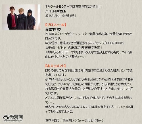 同时,《火影忍者疾风传》从1月9日开始的新ED《虹》将由日本的3人摇滚乐团“真空ホロウ”演唱,该组合成员全部来自茨城县,也是以茨城县为中心展开地下活动,2012年正式出道,曾演唱东京电视台音乐节目《摇滚兄弟》的片尾曲,这次又得到献唱东京电视台看板动画的机会。