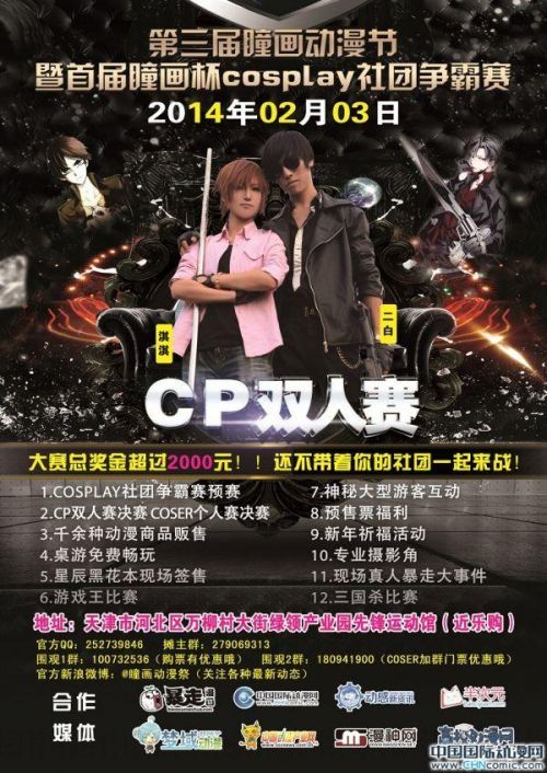 第三届瞳画动漫节暨首届瞳画杯cosplay社团争霸赛将于2014年2月3日在天津市河北区万柳村大街绿领产业园先锋运动馆启动。