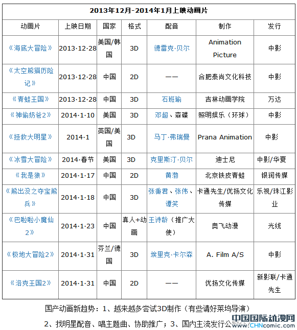 进口动画电影全是3D制作,有美国主流动画公司照明娱乐制作的《卑鄙的我2》、迪士尼动画制作的《冰雪皇后》,也有其它国家的动画团队制作的《拯救圣诞老人》和《极地大冒险2》。