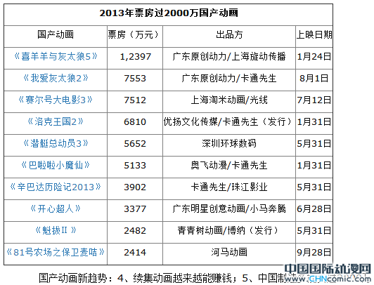 虽然国产动画电影多因“制作粗糙、内容幼稚”被诟病,但在市场上,表现大都不俗。统计数据显示,截止2013年12月15日,票房过2000万的国产电影约60部,其中国产动画电影10部,占比近17%。其中,《喜羊羊与灰太狼5》票房超过1.2亿,挤入年度票房榜前25。