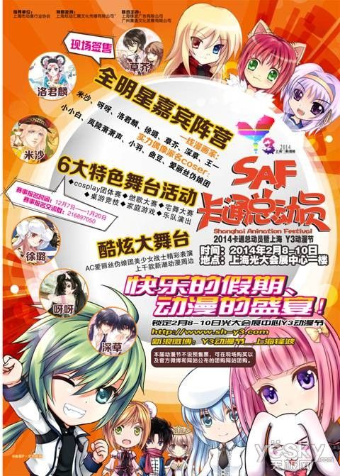 第一届Y3动漫节将在2014年2月8—10日在上海光大会展中心举办,它以“享快乐假期,品动漫盛宴”为主旨,内容将涵盖展会、大赛、活动等数个项目,在国内外的动漫形象、原创作品、创新技术、周边衍生产品以及动漫画内容商之间搭建起一个可供交流的体验式互动平台。
