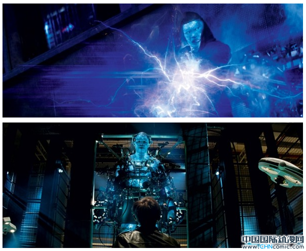 值得注意的是,在新公布的几张《超凡蜘蛛侠2》剧照中都以“电光人”作为主要人物,令人怀疑这个角色或是影片最终的最大反派人物。之前公布的剧照已经展示了“电光人”的变身前形象一——一位普通谦和的电路工程师Max Dillon。如今的这两张剧照则进一步展示了“电光人”的造型细节。