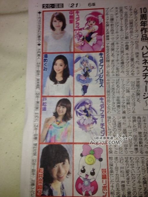 将在2014年2月2日起播放的「光之美少女」的第11部作品部「Happiness charge光之美少女」,公开了动画的声优情报,声优中岛爱、潘惠美、户松遥以及松井菜樱子都将加盟本作,同时网友还制作了历届光之美少女声优们的过去角色一览对比,大家会发现很多熟悉的角色声优都在里面!