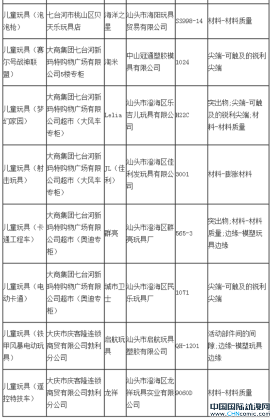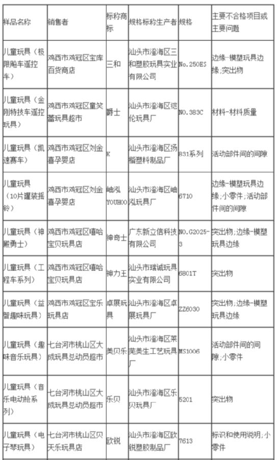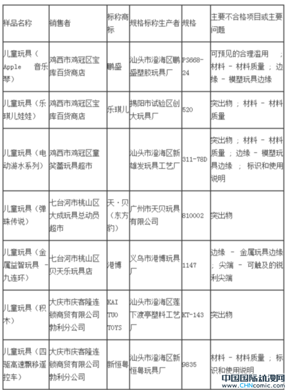 黑龙江省工商局对流通领域儿童玩具质量监测结果显示,部分儿童玩具存在模塑边缘、金属边缘、尖端、材料质量、突出物、小零件、膨胀材料、活动部件间隙等检验项目不符合国家标准要求,确定为不合格产品。