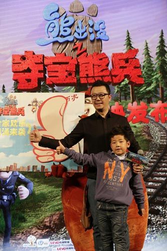 在当天的活动中,郭涛首次对媒体谈到他的“熊孩子养成记”。作为内地著名影星,郭涛平时片约不断,难得有时间陪在孩子身边,而每年的春节自然成了郭涛眼中的亲子“黄金时段”。在亲子方式的选择上,郭涛表示卡通作品一直都是最好的方式,同时感慨现在的国产卡通需要《熊出没之夺宝熊兵》这样符合合家、亲子概念的正能量作品,在观影过程中实现对孩子思想启迪和辨别能力养成,如此寓教于乐的方式要比“瞪眼睛、发脾气”更有效果。在郭涛眼中,石头是个成熟、有思想的孩子,所以教育孩子要讲究方式方法,不能只有严厉,尝试顺着孩子的思想摸索才能更好的达到目的。最后,在为影片全国“父母审片会”结果点赞的环节上,郭涛公开许诺石头春节一定带他去看《熊出没之夺宝熊兵》的3D大电影版。