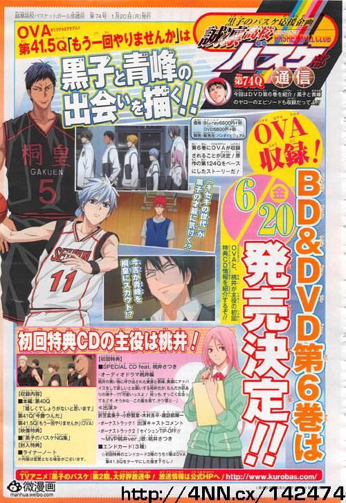 据杂志消息,人气动画《黑子的篮球》宣布推出新作OVA,预定6月20日发售的TV动画《黑子的篮球 2nd season》BD/DVD第6卷将同捆OVA第41.5话《不再做一次吗》。