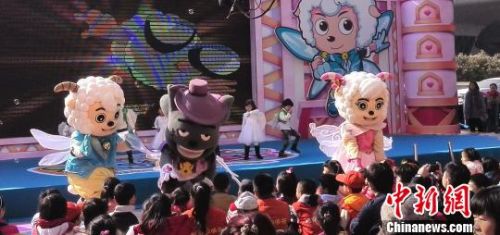 《喜羊羊与灰太狼大电影6之飞马奇遇记》16日即将在全国上映,电影出品方15日在广州举行首映礼,图为喜羊羊里面的“灰太狼”、“喜羊羊”等角色走出大银屏,和众多小朋友们一起载歌载舞。