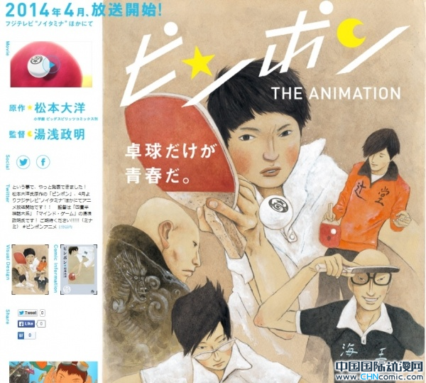 又是一部体育类的作品,是日本漫画家松本大洋的代表作「乒乓」,该漫画于1996年-1997年在小学馆的「Big Comic Spirits」上连载,一共有55话。「乒乓」动画将由汤浅政明担任监督,在四月以作为春季新番在富士电视台的noitamina栏目中播出。从画风来看,就知道这片应该不会搞基了吧,会专注与竞技本身。