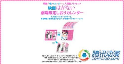 被读者们亲切地称为《友少》的人气轻小说——《我的朋友很少》的真人电影版将于2月1日在日本正式上映,届时入场观看将会获得官方派发的小礼品一份。礼品是印有动画版角色的书签和印有真人版角色的日历,一共有三个种类。