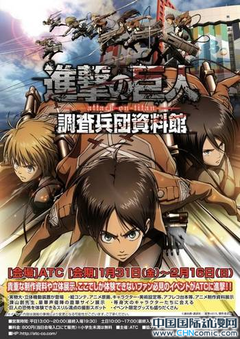 据悉,在2014年1月31日—2月16日将开展“进击的巨人 调查兵团资料馆 ”in 大阪南港ATC的活动。届时将展出《进击的巨人》动画设定资料集、一比一的《进击的巨人》实物立体机动装置、壁上的巨人再现、角色等身大看板、《进击的巨人》作者以及《进击的巨人》动画声优的亲笔签名色纸、限定商品等。从下面的预览图中可以看到此次《进击的巨人》会展的部分设置,能够充分的感受到《进击的巨人》漫画中的气氛和巨人逼近的压迫感。