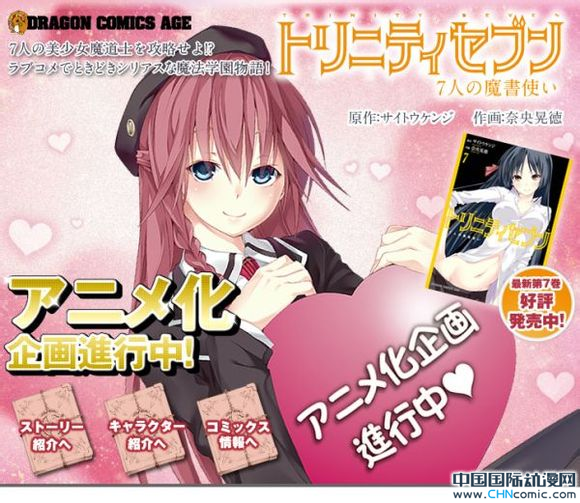 奈央晃德负责作画的少年漫画《七人魔法使》在特设页上宣布本作的动画化企划进行中!详细情报则有待官方进一步更新。漫画《七人魔法使》是自2011开始在《月刊Dragon Age Pure》上连载的作品,内容涵盖了冒险、魔法、后宫等题材。目前《七人魔法使》漫画已经推出了7卷单行本,并推出了广播剧CD,声优包括了细谷佳正、下屋则子、伊濑茉莉也、茅野爱衣、藤田咲、三森铃子、小林优、大久保瑠美、藤村歩、三上枝织、游佐浩二等人。 不知此次动画化是否会沿用这个阵容?