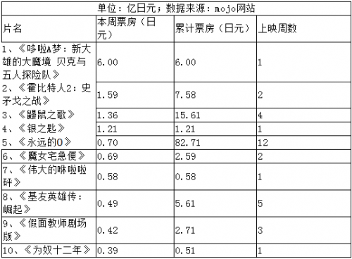 续映电影中排名第五的《永远的0》上映已经12个月,累计票房为82億7135万5500日元。已经超过2007年木村拓哉主演的《HERO》的81.5億日元成绩,但距离2004年85亿的《在世界中心呼唤爱》还有一段距离;排名本周第六的真人版《魔女宅急便》两周票房达到2.59亿。