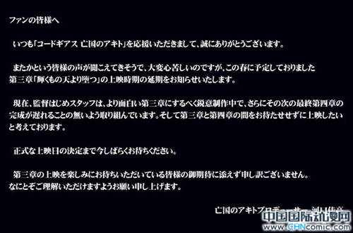 非常感谢大家能够一直支持《Code Geass 亡国的阿基德》。相信有很多观众都已经猜到我想说什么了。是的,非常抱歉,本来预定于2014年春天上映的《Code Geass 亡国的阿基德》系列《亡国的阿基德第3章 光辉从天坠落》即将延期上映了。